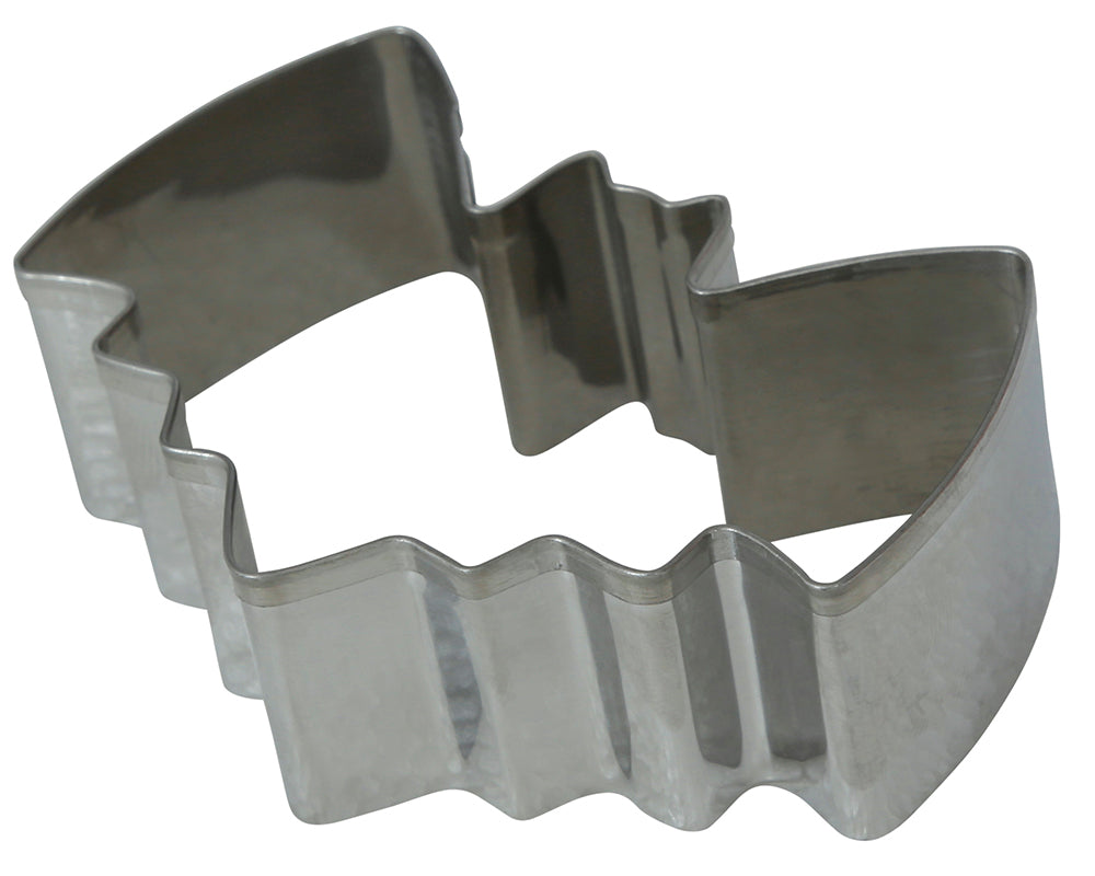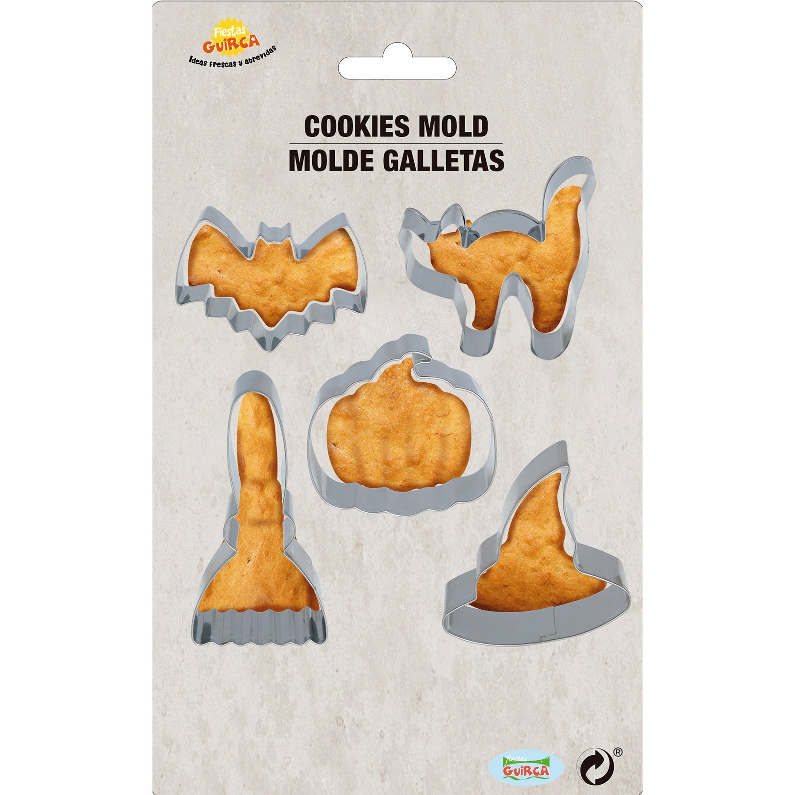 Set med 5 metallformar i klassiska Halloweenformer: katt, pumpa, häxkvast, fladdermus och häxhatt. Perfekta för att baka pepparkakor och andra bakverk.
