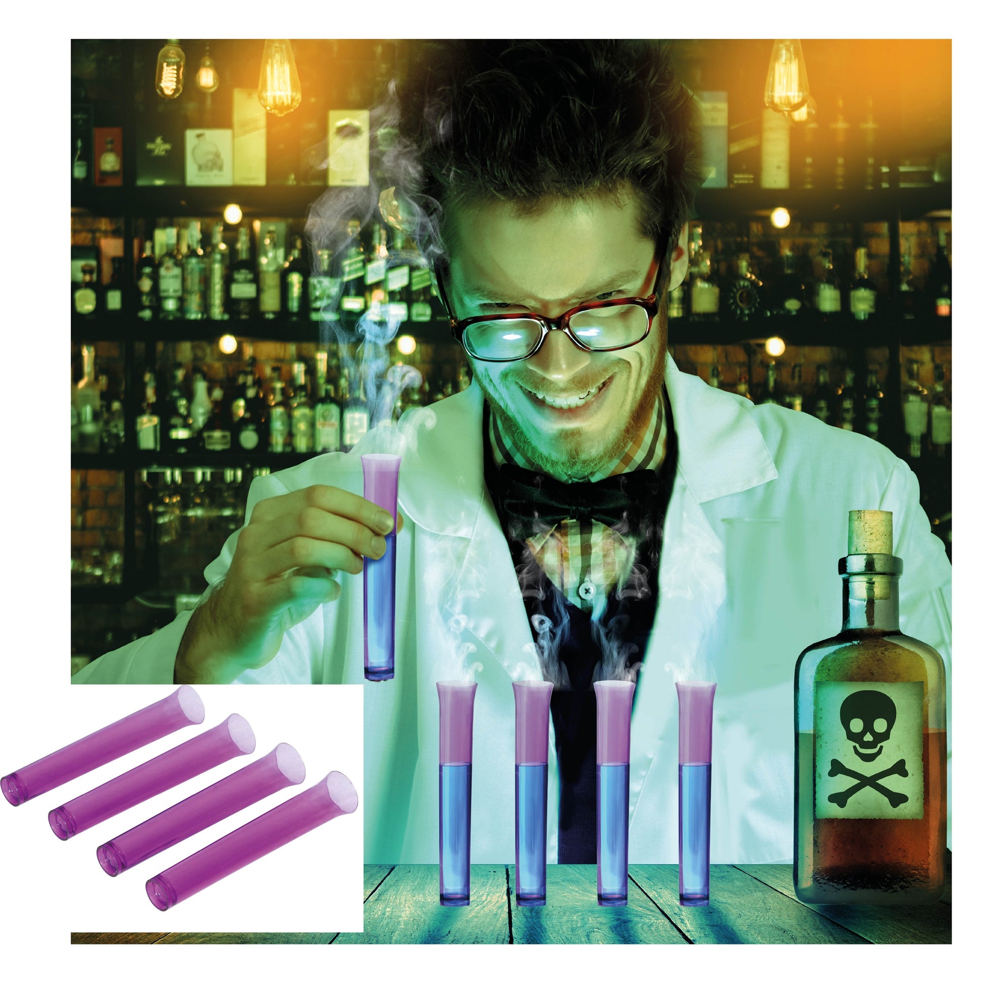 Set med 4 lila provrör i plast, avsedda för servering av dryck – ett kul och annorlunda inslag till fest eller Halloween.