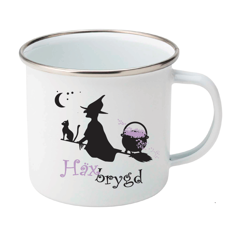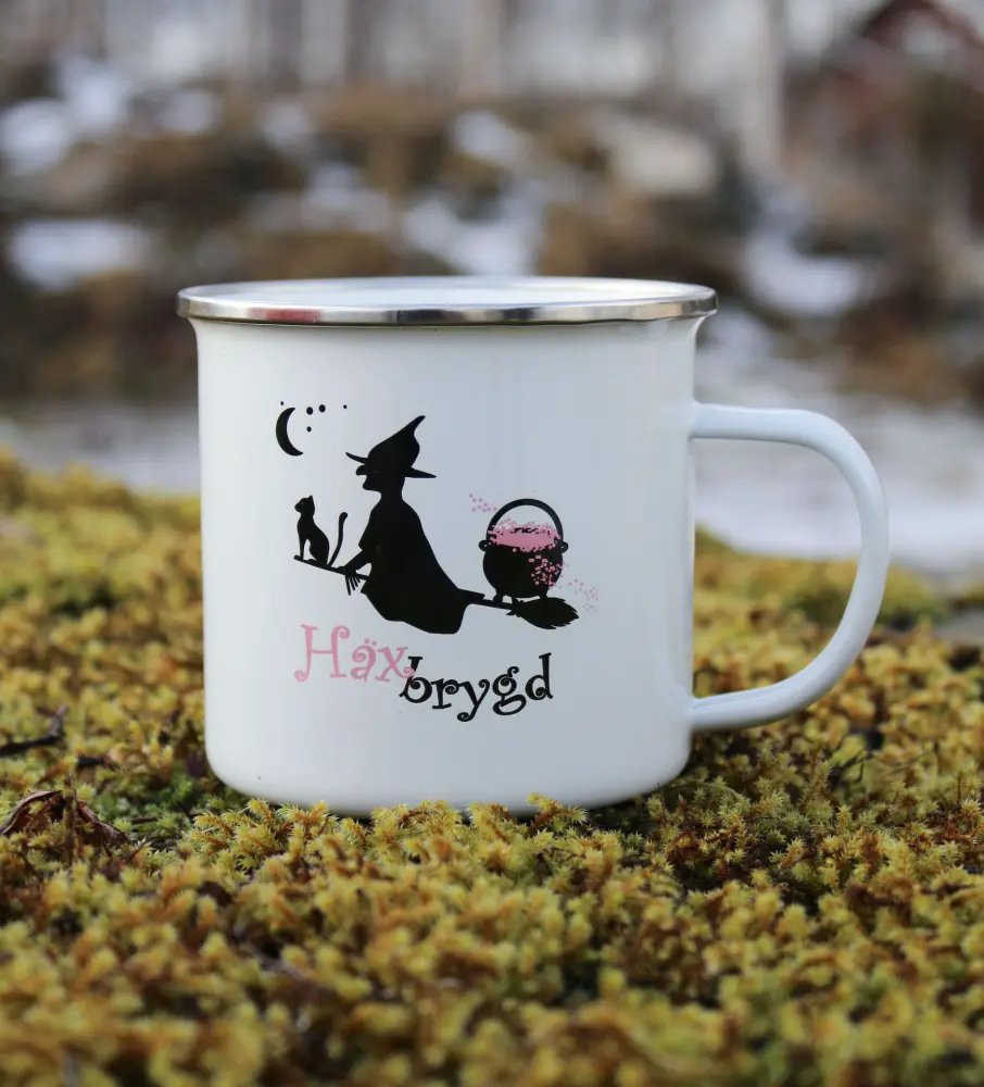 En mugg med magisk känsla! Denna retromugg i emalj med texten "Häxbrygd" tillsammans med en illustration av en häxa på sin kvast – perfekt för te, kaffe eller en rykande kopp trolldryck.