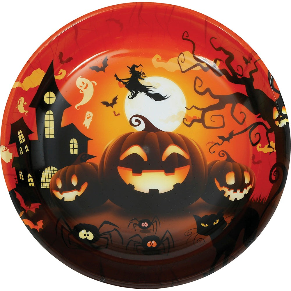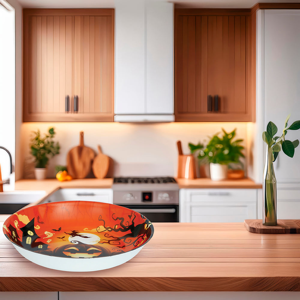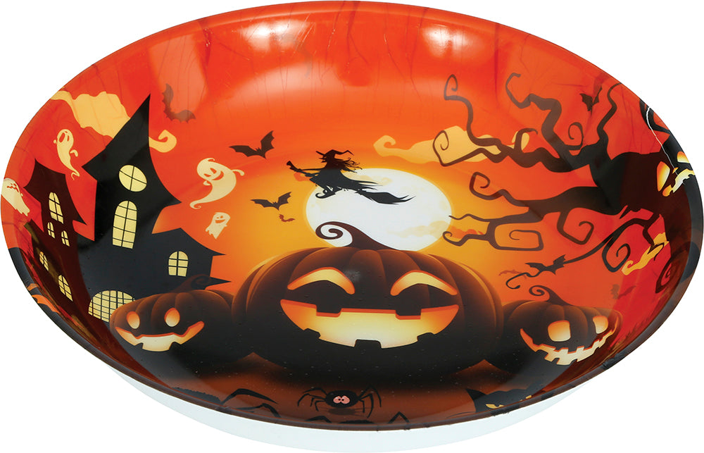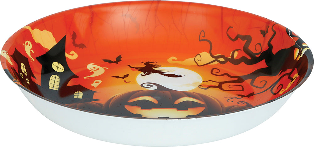 Stor serveringsskål i plast med pumpatema – perfekt för snacks, godis eller andra tilltugg till Halloween eller temafester.