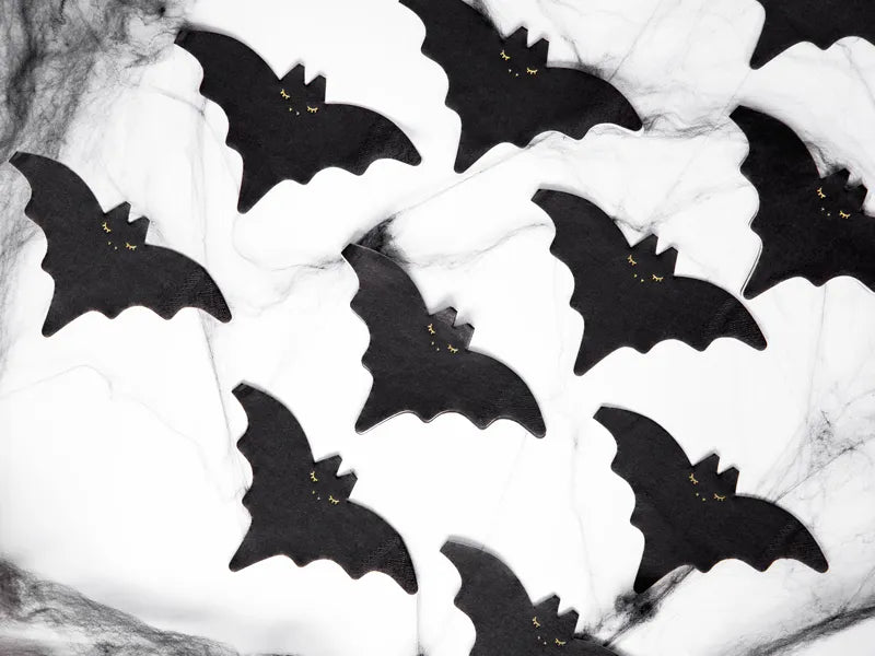 Pappersservetter i form av fladdermöss i svart med guldfärgat metallic-tryck. Storlek hopvikt ca 16 x 9 cm, utfälld ca 32 x 18 cm. Förpackningen innehåller 20 st. Perfekta för halloweendukningen.