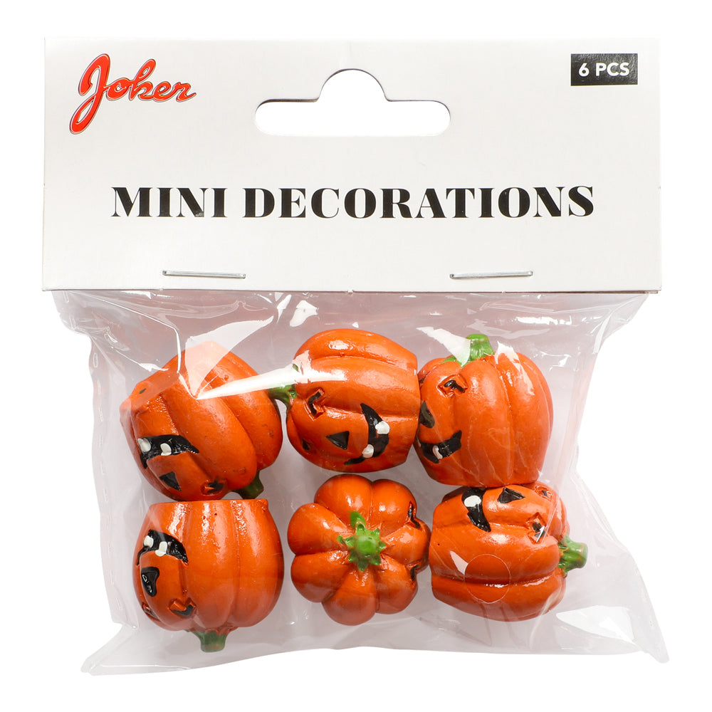 Små dekorationspumpor i polyresin, 6-pack. Perfekta för halloweenpynt på bord, i fönster eller som del av en höstarrangemang. Mått per pumpa: ca 2,3 x 2,3 x 2,3 cm.