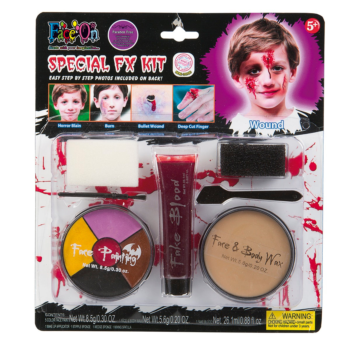 Allt-i-ett sminkkit för barn som vill skapa coola specialeffekter! Innehåller oljebaserade ansiktsfärger i gult, svart, rosa, brunt och rött (8,5 g), vax för ansikte och kropp (6,5 g), vattenbaserat teaterblod (26,1 ml), två svampar, en pensel och en plastspatel. Perfekt för Halloween, maskerad och fantasifull lek!