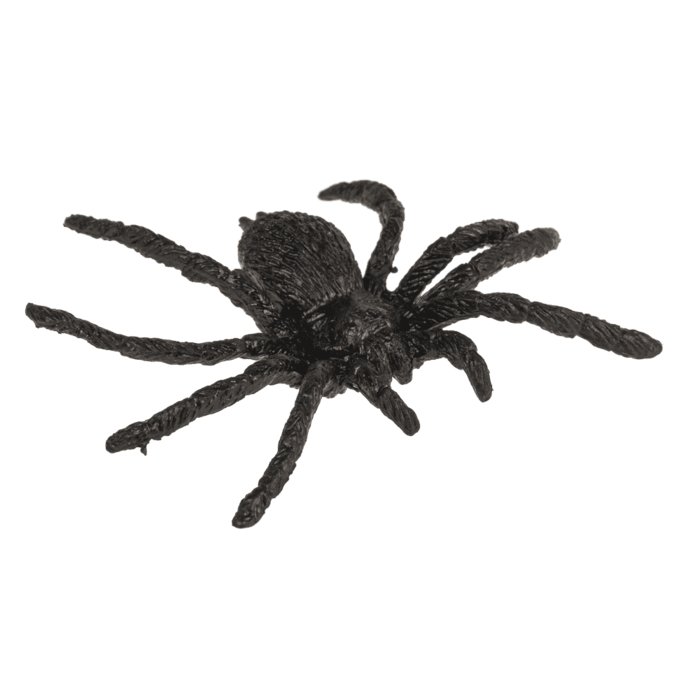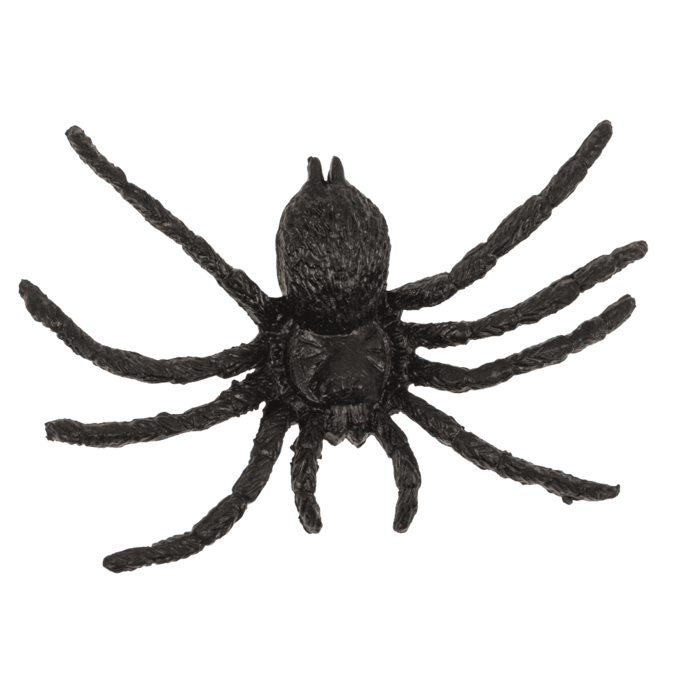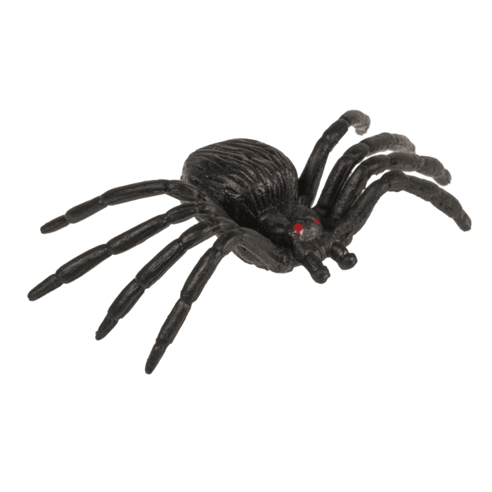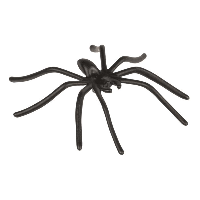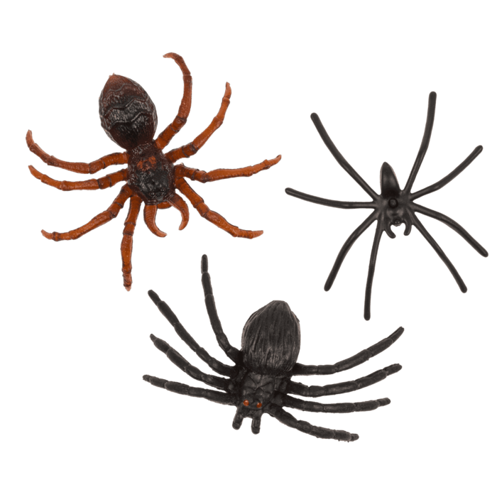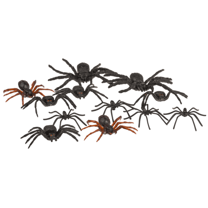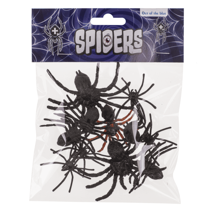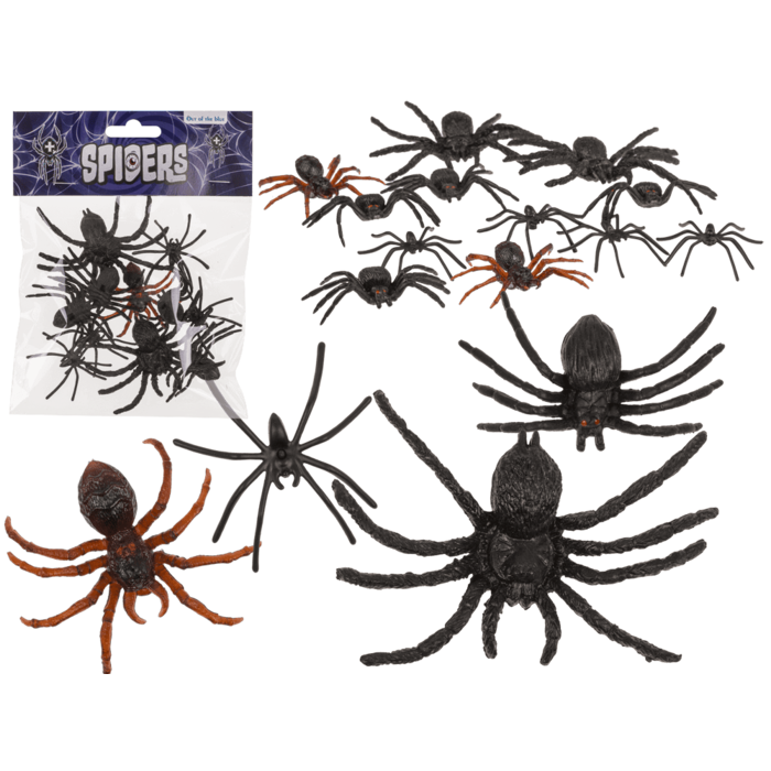 Set med 12 spindlar, tillverkade i plast. Varje spindel är ca 5 x 6 cm. Perfekta som dekoration till halloween eller skrämmande lek.
