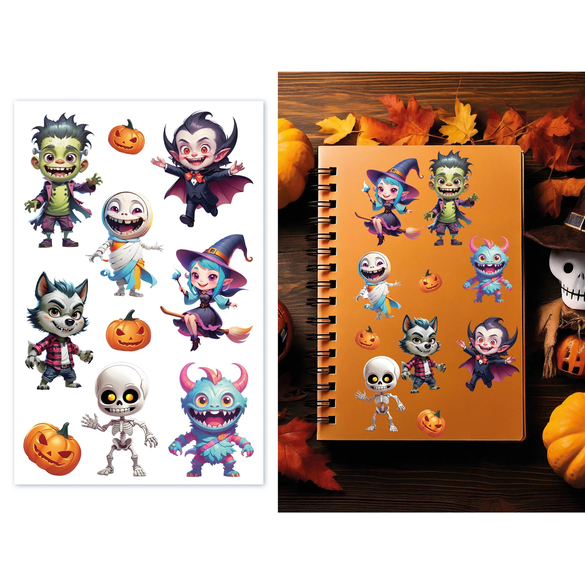 Ett ark med semi-realistiska halloweenstickers som gör det enkelt att dekorera både pyssel, inbjudningar och festprylar. Motiven inkluderar klassiska figurer som pumpa, Dracula och skelett.