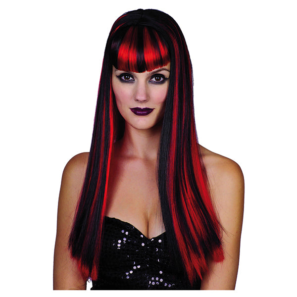 Gothic-peruk i svart och rött för vuxna. Tillverkad av PET. Perfekt som accessoar till halloween, maskerad eller skräckinspirerade utklädnader.