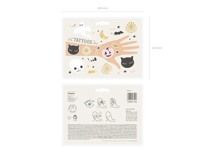 Temporära halloween-tatueringar i mixade färger och motiv. Setet innehåller 12 olika tatueringar med bland annat katt, pumpa, spindelnät och fladdermus. Perfekta för halloweenfesten!
