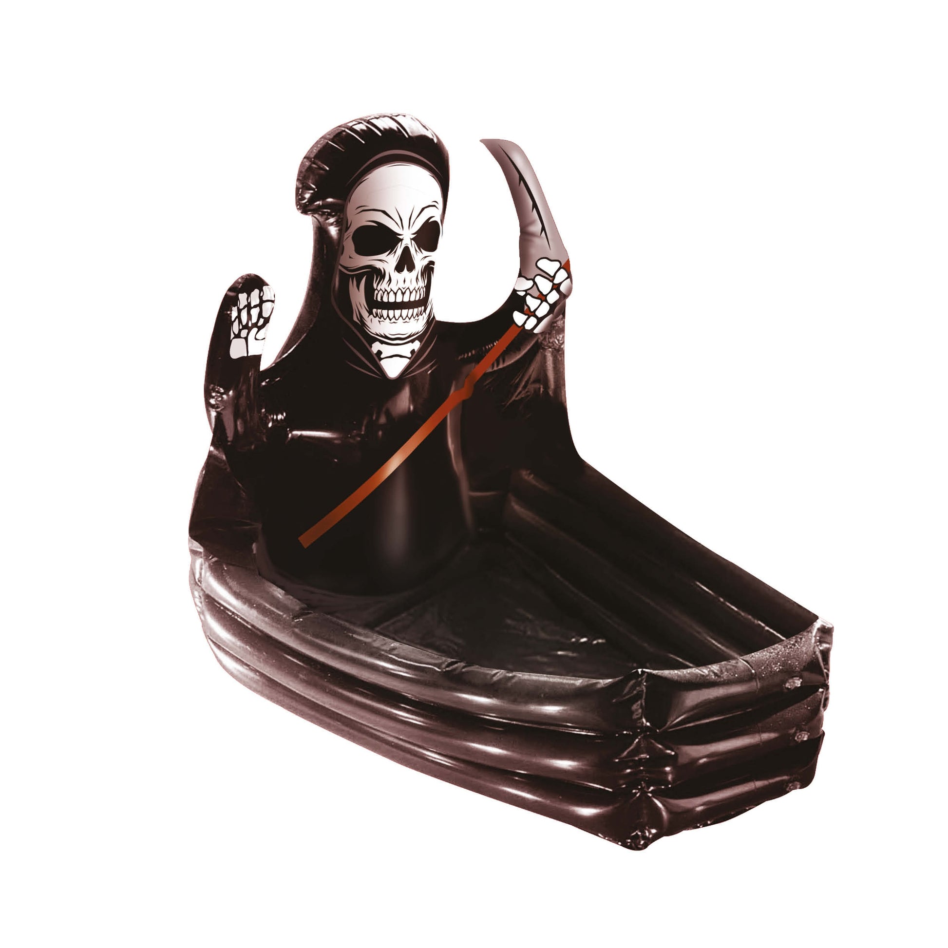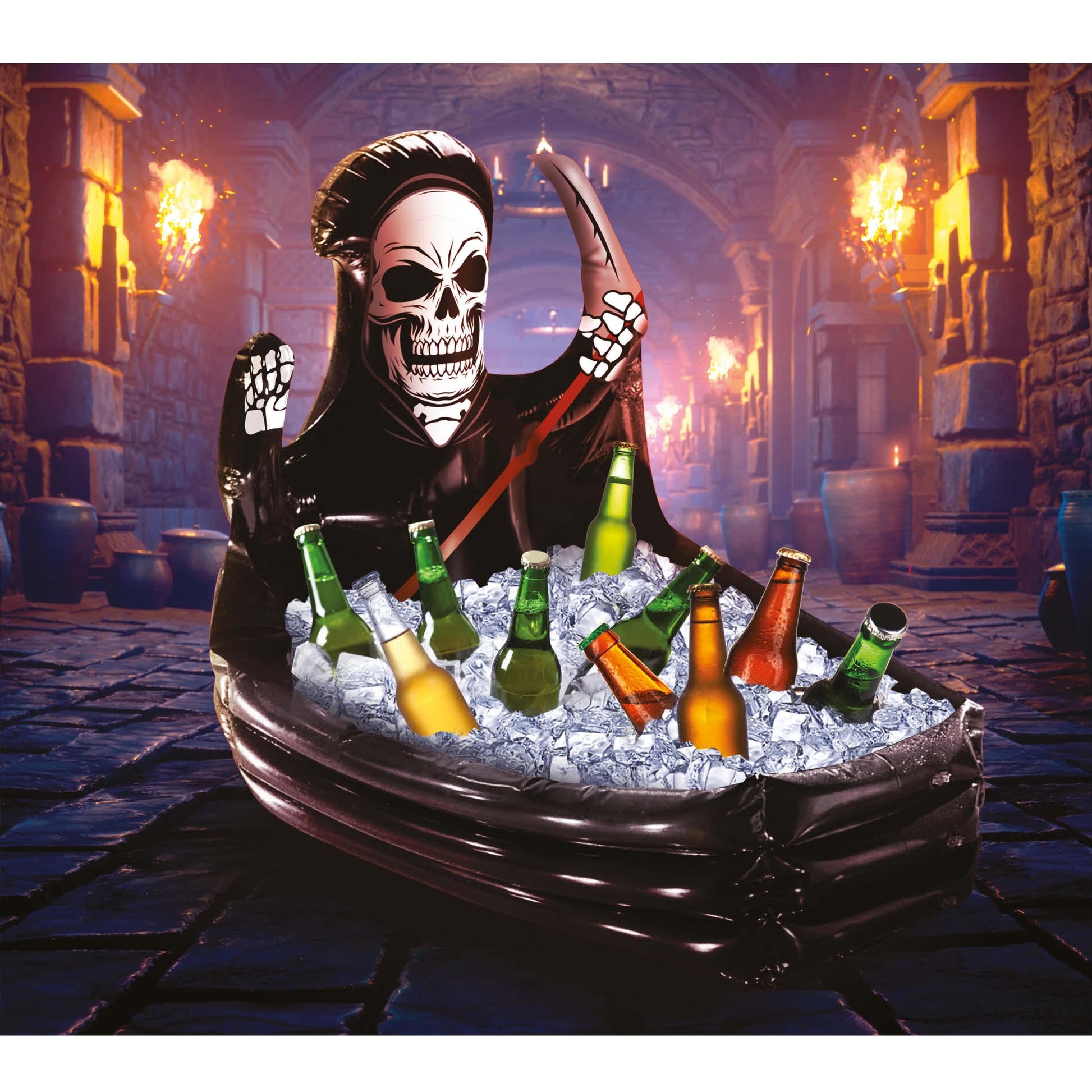 Uppblåsbar dryckeskylare i form av ett skelett – både praktisk och dekorativ till Halloweenfesten. Fylls med is och dryck, och håller innehållet kallt under festen.